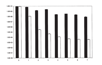 Рис. 1 Наиболее вероятная величина популяции кишечной палочки в течении семи дней эксперимента (логарифмическая шкала) (наиболее вероятное колличество клеток в одном грамме)
